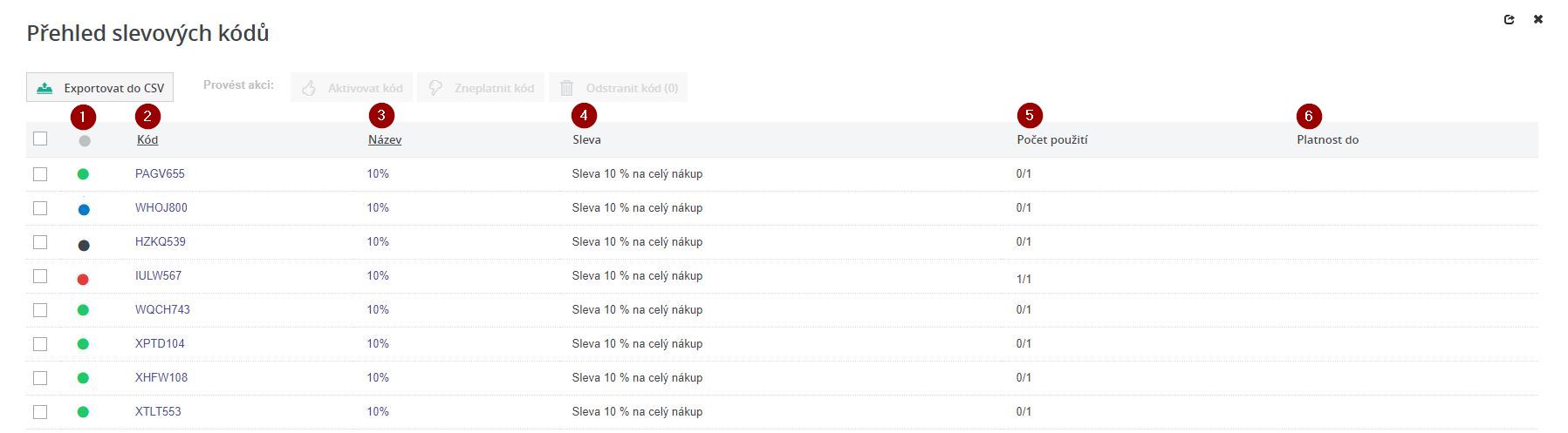 Slevový kód umožňuje zákazníkovi využít slevu na nákup produktů. Kódy představují absolutní nebo procentuální slevu buď na všechny, nebo pouze konkrétní produkty.